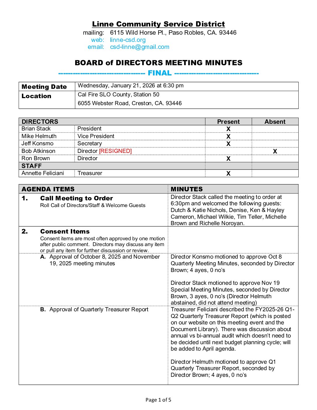 2. Consent Items A. Approval of October 8, 2025 and November 19, 205 meeting minutes B. Approval of Quarterly Treasurer Report 3. Old Business A. FEMA reimbursement. Director Stack B. 2026 Road Maintenance Scope Approval. Director Konsmo 4. New Business A. Website update including hosting options. Director Konsmo B. LAFCO Municipal Service Review (MSR) and