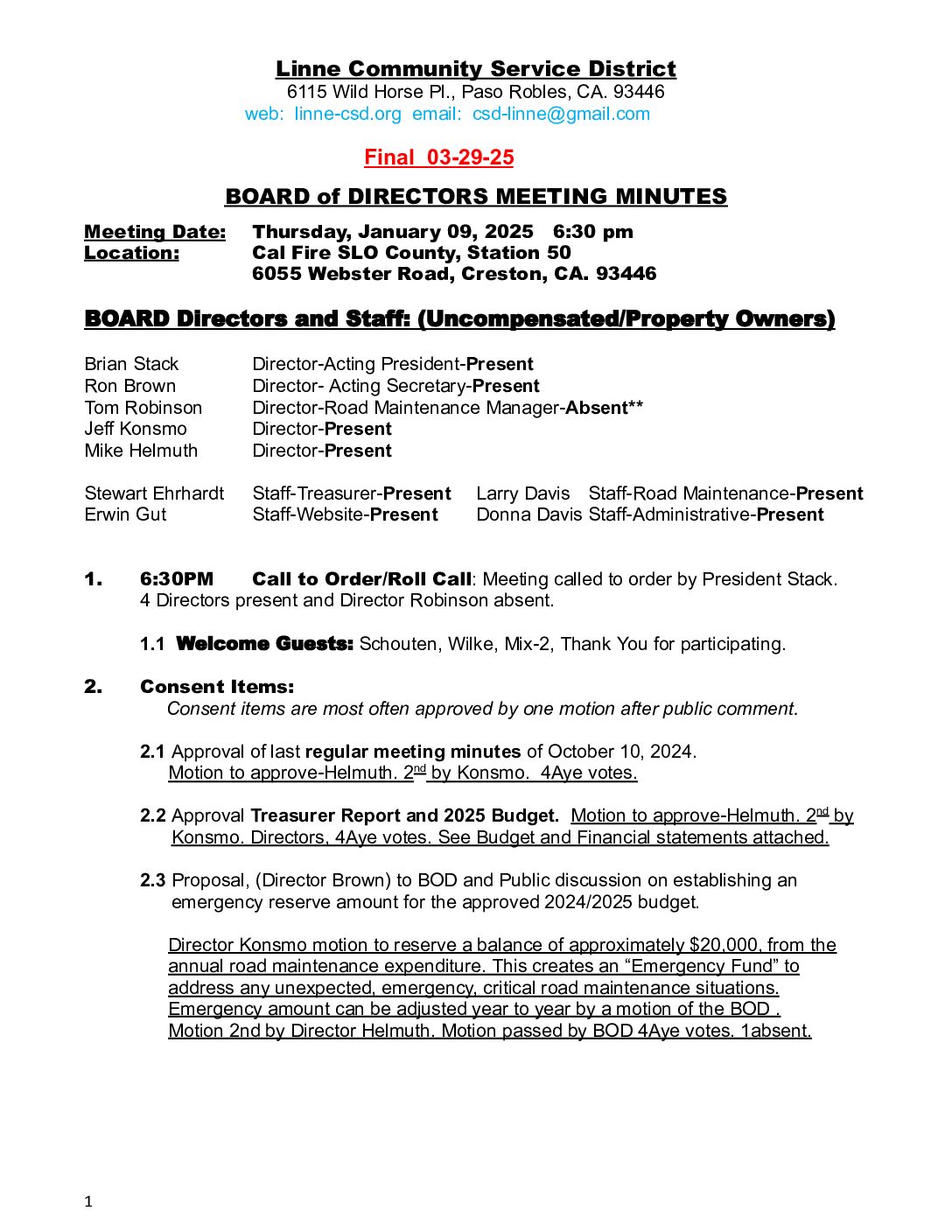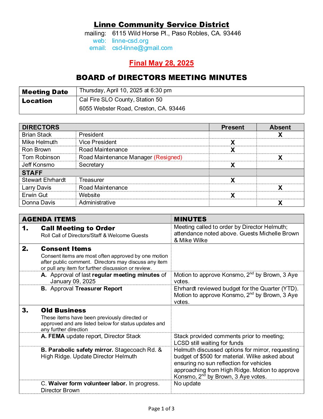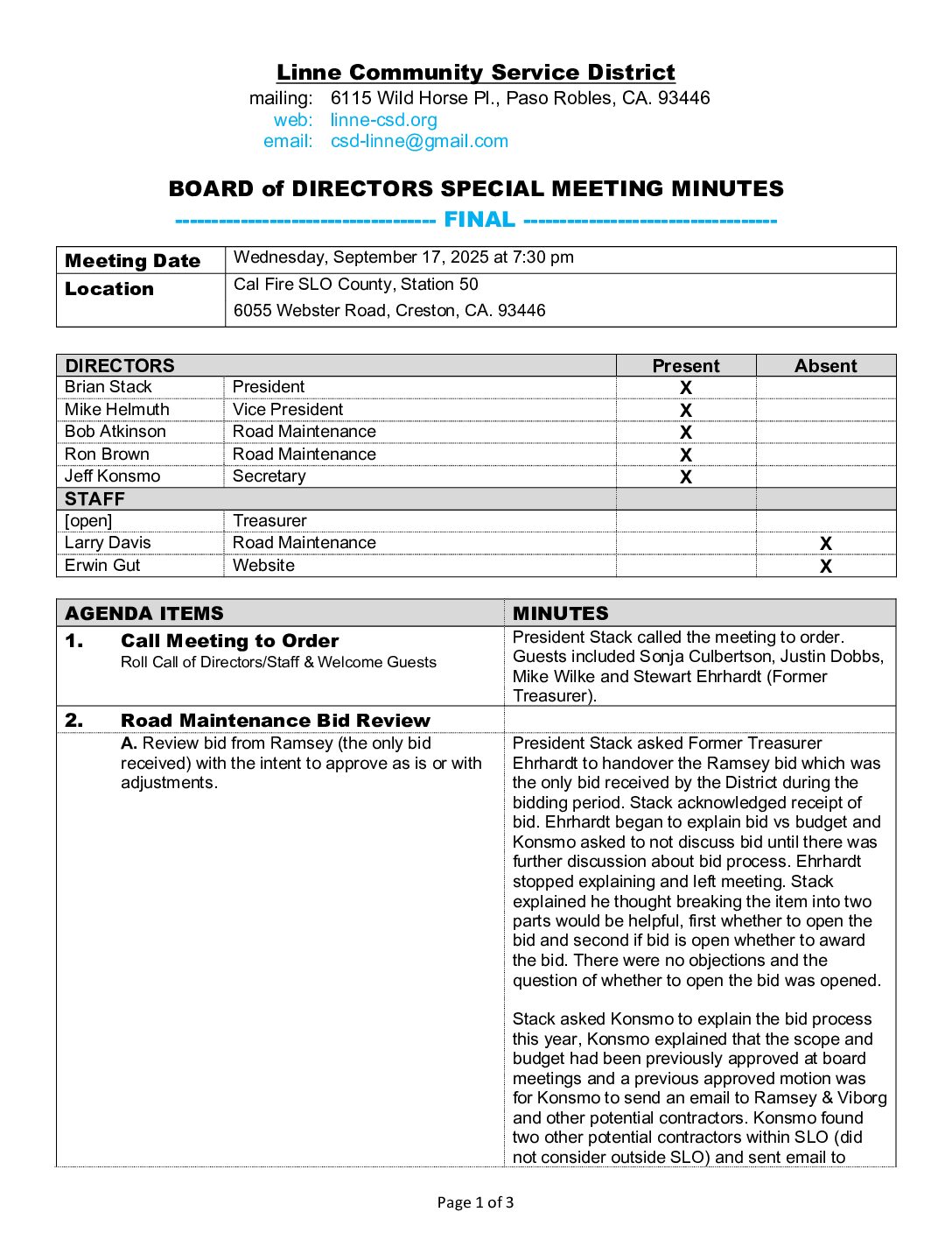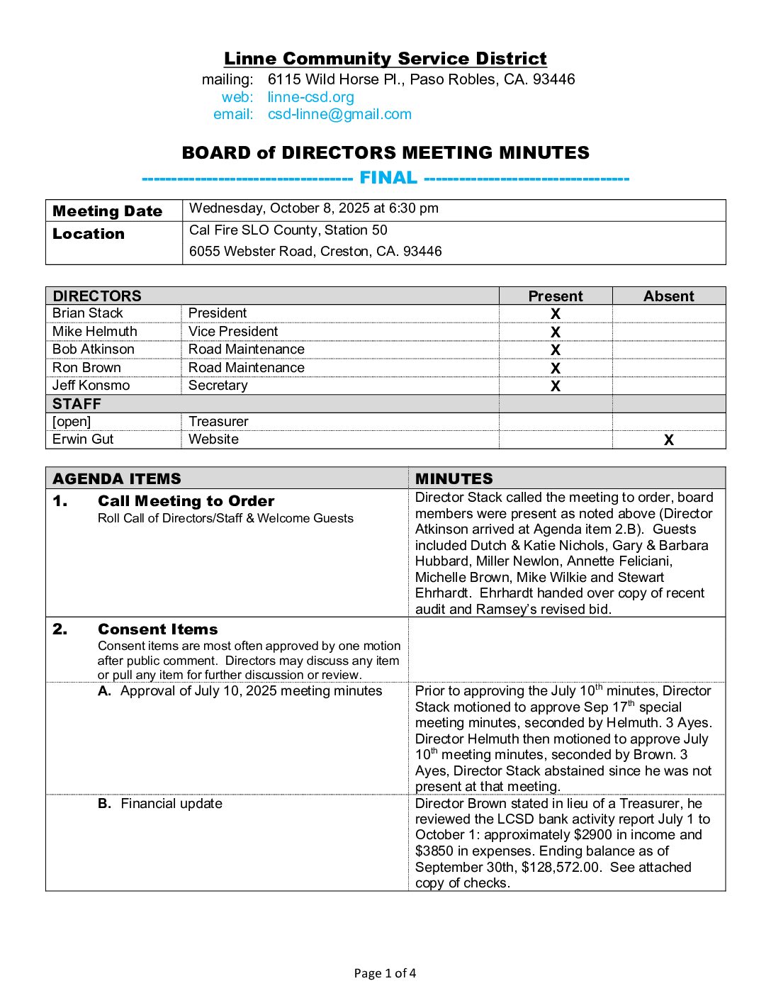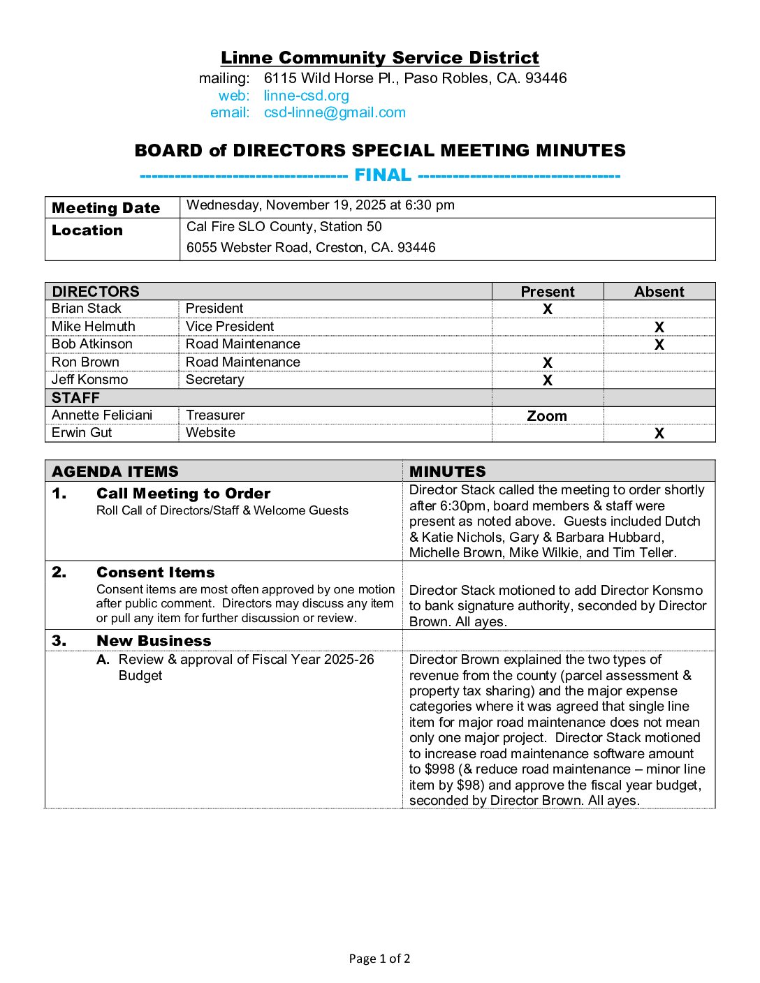 3. New Business A. Review & approval of Fiscal Year 2025-26 Budget B. Review of 2026 road maintenance scope within the multi-year plan for planning purposes; approval will be requested at January 2026 meeting C. Request for erosion prevention on hillside just passed bulletin board on Stagecoach